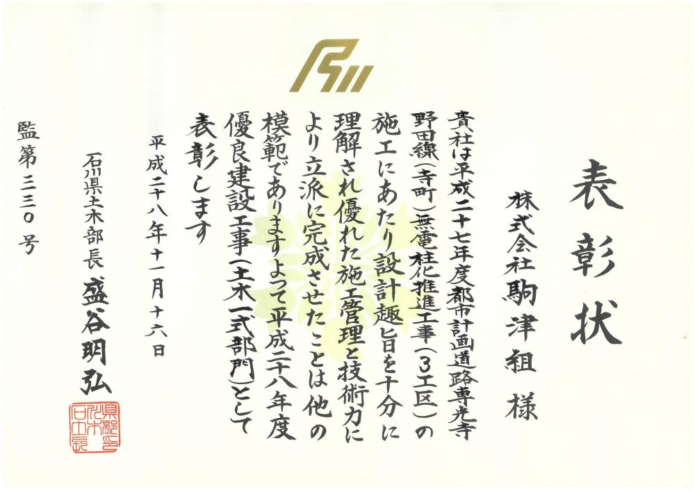 平成28年11月16日日に石川県優良建設工事施工業者表彰が行われ、当社が施工した専光寺野田線(寺町)無電柱化推進工事(3工区)が部長表彰を受賞しました。